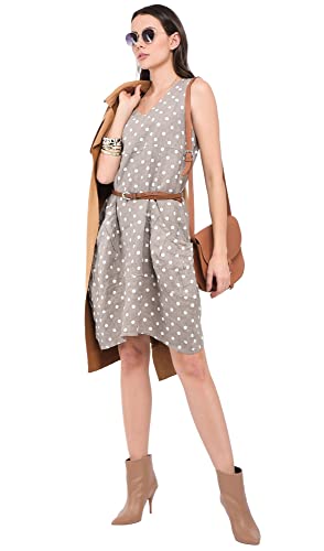 Bonateks Damklänning 100% linne tillverkad i Italien, halvlång rund hals klänning med fickor och prickigt tryck, taupe, storlek: S, brungrått, S