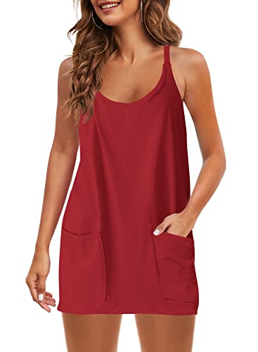 Panadila Ärmlös sommarklänning för kvinnor, v-ringad, spagettirem, solklänning, atletisk kort klänning med fickor, Vinröd, S