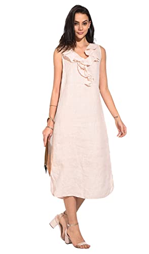 Bonateks Damklänning 100% linne tillverkad i Italien, flytande A-linje klänning med halvärmar och fickor, öken, storlek: L, Öken, L