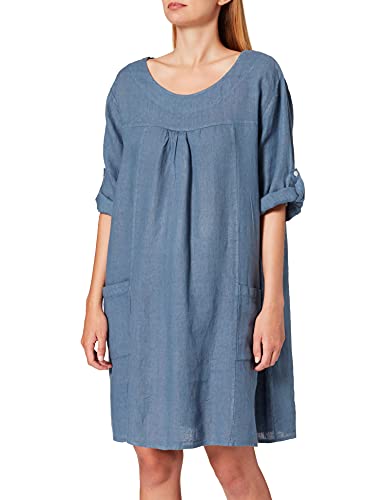 Damklänning 100% linne tillverkad i Italien, kort rund hals klänning med fickor och fästbara långa ärmar, jeansblå, storlek: L, Jeans blå, L
