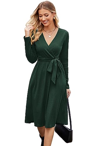 Newshows stickad klänning dam höstklänning V-ringad tröja klänning vinterklänning klänning klänning med fickor för höst vinter, Mörkgrön, S
