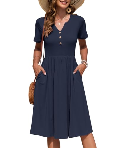 AUSELILY Kortärmad sommarklänning för kvinnor, med empirmidja, midi-längd, vardaglig, v-ringad, veckad klänning med fickor, marinblå, XL