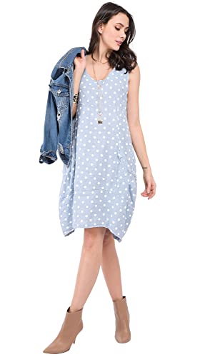 Bonateks Damklänning 100% linne tillverkad i Italien, halvlång rund hals klänning med fickor och prickigt tryck, himmel, storlek: L, Himmel, L