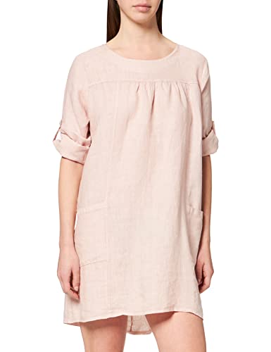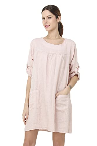 Damklänning 100% linne tillverkad i Italien, kort rund hals klänning med fickor och fästbara långa ärmar, rosa, storlek: XL, rosa, XL
