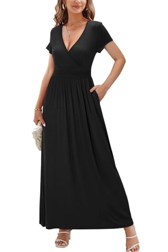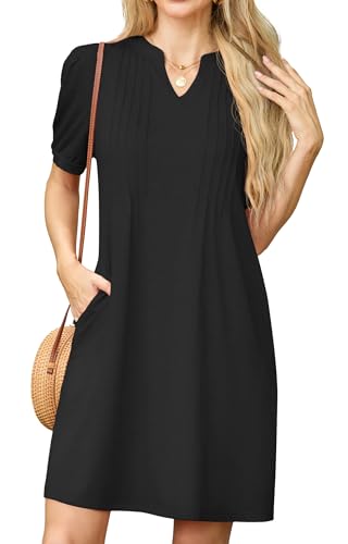 GRECERELLE Damklänningar sommar vardaglig kortärmad v-ringad skiftklänning för kvinnor damer t-shirt klänning med fickor, Svart, XL