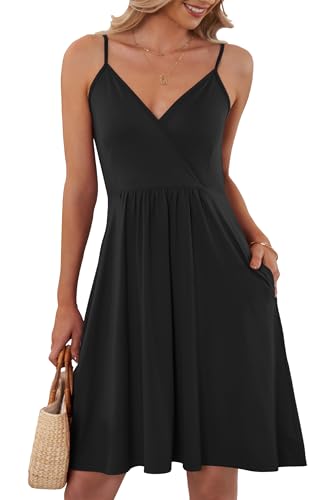 AUSELILY Damsommarklänningar spagettirem strandkläder täckande v-ringad vardaglig klänning med fickor, Svart, L