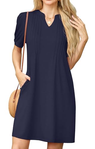 GRECERELLE Damklänningar sommar vardaglig kortärmad v-ringad skiftklänning för kvinnor damer t-shirt klänning med fickor, marinblå, L