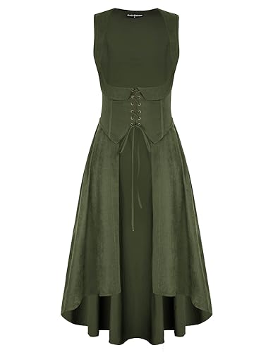 Scarlet Darkness kvinnor renässansdräkt under byst pirat bonde hög låg klänning med fickor, Armégrönt, S
