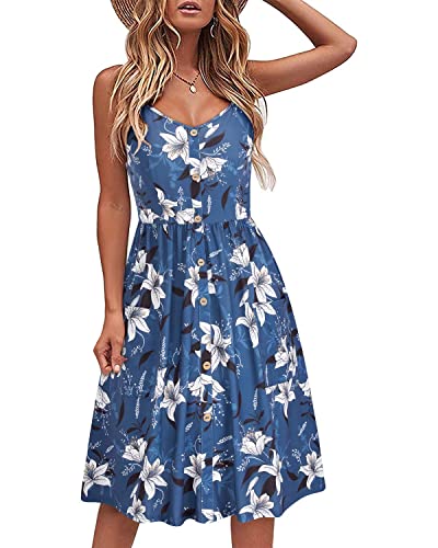 AUSELILY Sommarklänningar för kvinnor UK V-hals spagettirem avslappnad klänning strand med fickor, Blå blommor, M
