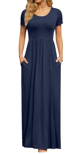 AUSELILY Sommarklänning för kvinnor kortärmad maxi strandklänning V-ringad solklänning slits klänning med fickor eleganta klänningar, marinblå, M