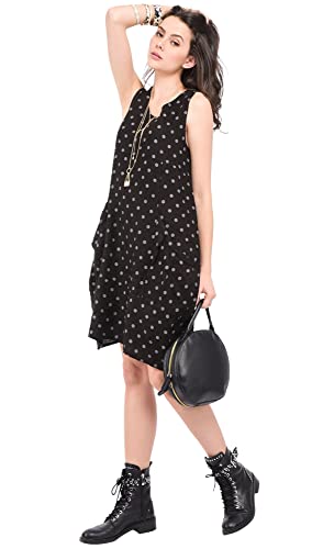 Bonateks Damklänning 100% linne tillverkad i Italien, halvlång rund hals klänning med fickor och prickigt tryck, svart, storlek: S, svart, S