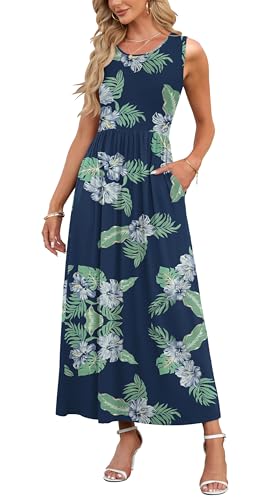 Auselily Enfärgad maxiklänning för kvinnor, enkel, somrig, mörk blågrön, ärmlös, lös, ledig, lång klänning med fickor, Grön bladblomma, M