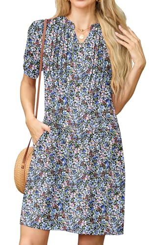 AUSELILY Sommarklänningar för kvinnor vardaglig t-shirt kortärmad klänning lös gunga kort klänning med fickor, Blommig röd, M