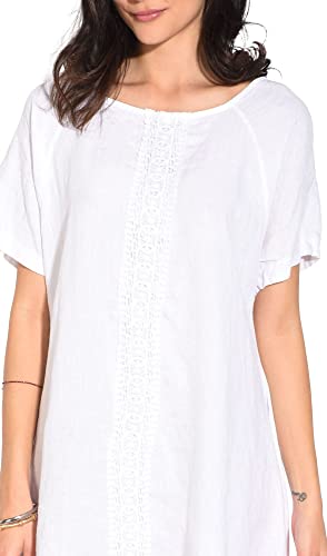 Bonateks Damklänning 100% linne tillverkad i Italien, flytande A-linjeskuren klänning med halvärmar och fickor, öken, storlek: M, Öken, M
