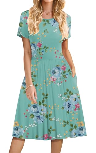 DB Moon Kortärmade klänningar för dam, sommar, empire-midja, ledig klänning med fickor, Grönt blommig, L