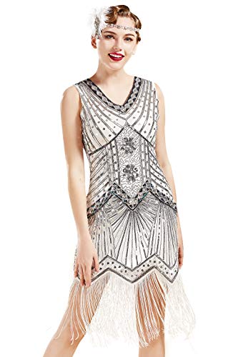 BABEYOND Flapperklänning, V-ringad, med pärlor och fransar, 20-talsklänning, Great Gatsby-klänning, SILVER, M