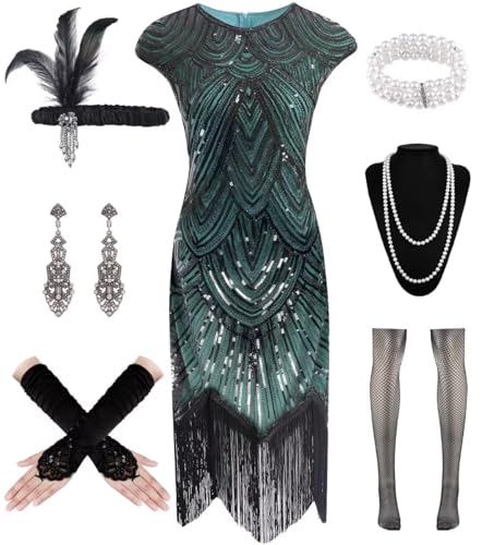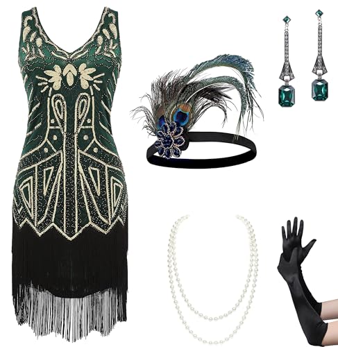 ELFIN 20-tals klänningar flapperklänning dam vintage 1920-tals kostym klänningar paljetter fransar Gatsby-klänning 20-tals tillbehör med pannband, huvudbonad, långa svarta handskar, halsband, L, grön