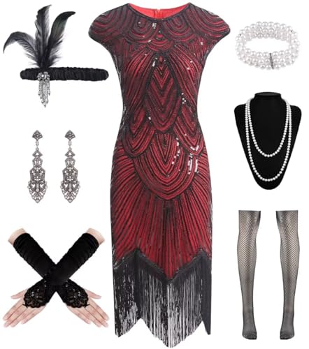 Gammify 1920-tals damklänning, set med tillbehör, V-ringad klänning med paljetter, pärlor och fransar, storlek L, röd