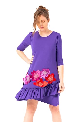 Mamatayoe Harmony. Kort damklänning med volanger och lila broderade detaljer för höst vinter elegant avslappnad stil kortärmad flytande klänning, Lila, S