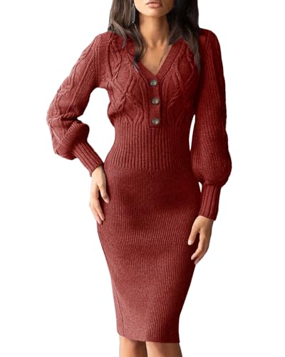 Cicy Bell Damtröjklänning V-ringad knälång stickad klänning med knapp sexig lanterna långärmad klänningar lång vinter midiklänning, Vinröd, M