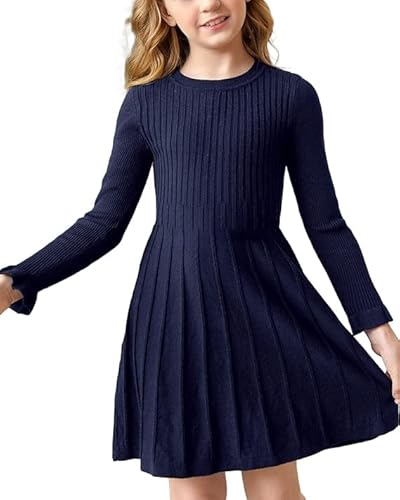 Haloumoning Flicktröja klänning långärmad A-linje stickad klänning varm skola höst vinter klänning enfärgad basic fritidsklänning festklänning, Mörkblå, 130 cm