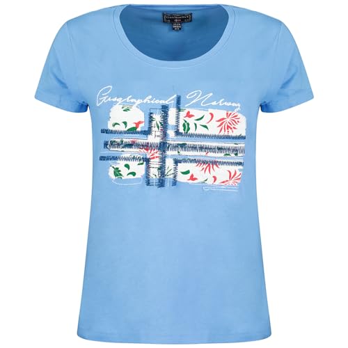 Geographical Norway Jepson Lady T-shirt med V-ringning för dam - modetröja med normal passform - kortärmad klänning märke - vår sommar höst vinter (blå L), Färg: blå, L