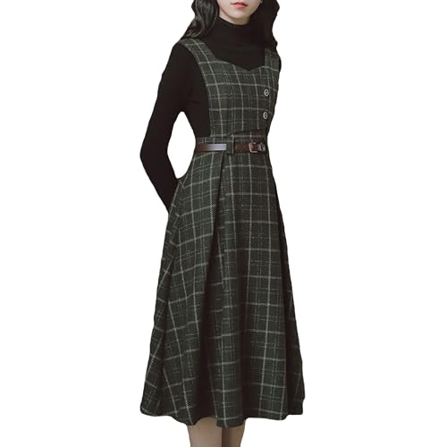 Cuteighteen ärmlös rutig klänning med bälte för kvinnor höst vinter ull elegant midi-overall pinafore förkläde klänning, gRÖN, M