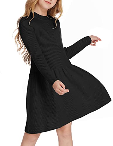 Arshiner Flicktröja klänning höst vinter klänning långärmad stickad klänning flare skater klänning A-linje enfärgad basic barn fritidsklänning, svart, 120