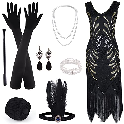 ELECLAND 1920-tal V-ringad paljett pärlkantad klänning med 20-tal tillbehörsset (svart, medium)