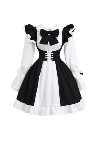 OUTLETISSIMO Klassisk svart vit dam Maid Dräkt – Lolita servitrisklänning med randig kjol, långa ärmar och rosett – cosplaydräkt för fest, karneval, halloween, storlek S