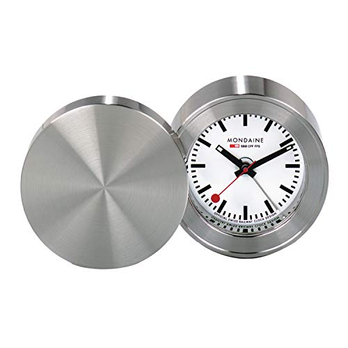 Mondaine Väckarklocka MSM.64410 bordsklocka 50 mm - Officiell schweizisk järnvägsklocka borstad metallhölje visare synlig i mörkröd sekundvisare, SILVER, Klassisk