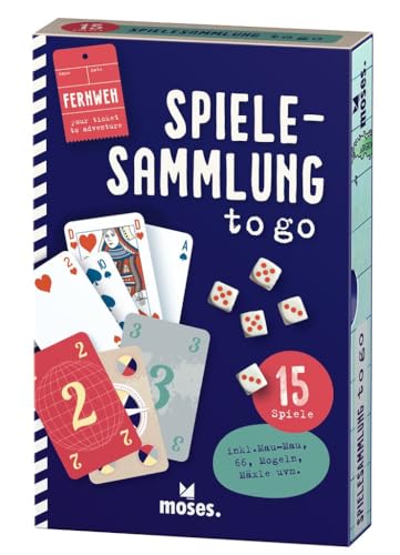 moses 4033477901736 spelsamling to go, 15 spelklassiker för resor tidlösa kortspel och tärningsspel i set, klassiska brädspel från 8 år, blå