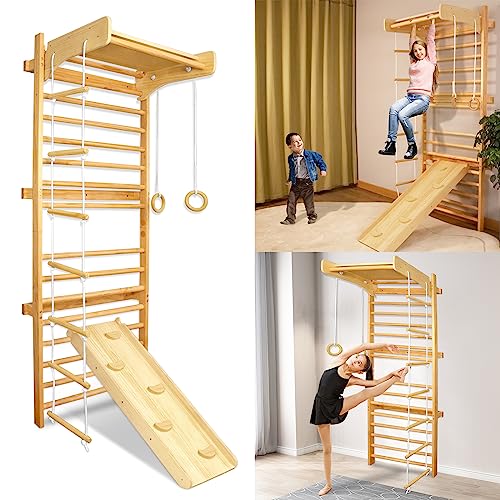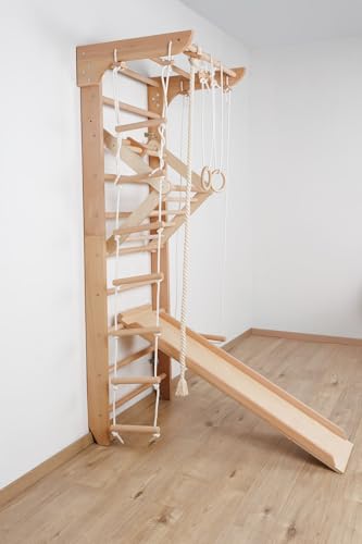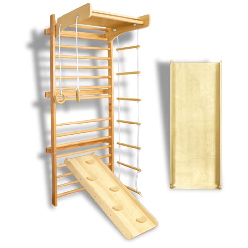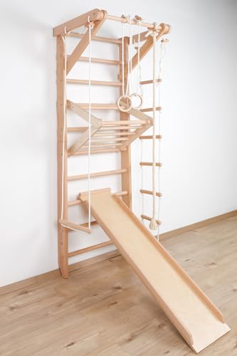 Ribbstol, barnrum, gym vägg, barn, småbarn | Klätterställning inomhus, gymnastikvägg av naturligt trä (210 cm) | Gymnastikringar barn med repstege, gunga | 100 % ECO | tillverkad i EU