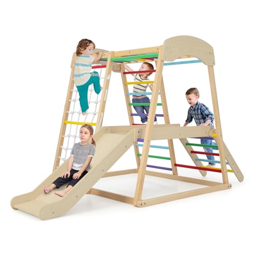 GOPLUS Klätterställning för barn, klätterleksaksset med klätterstege och rutschkana och klättringsnät och tvärstång, mångsidigt lektorn, klättertorn, inomhus av trä för barn från 1 år (färgglad)
