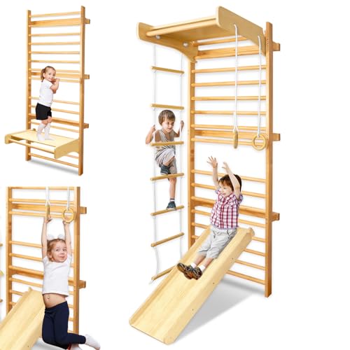 Ribbstol barnrum, gym vägg barn, småbarn | Klätterställning inomhus, gymnastikvägg av naturligt trä | Gymnastikringar barn med repstege, gunga | 100 % ECO | Tillverkad i EU ..