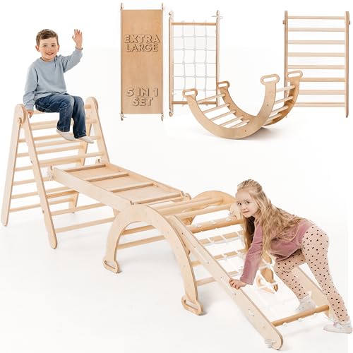 5-i-1 Inomhus Klätterställning för Småbarn - Trätrio, Båge & Klätterramp & Nät & Kudde, Montessori Klätterställning, Trä-Gym för Barn, Fällbara Klätterleksaker för Barn 1-5 År