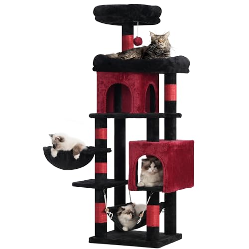 Heybly Klösträd, 145 cm högt flervåningshjälps-klättertorn, med 2 stora plattformar, 2 stora kattbon, kattkorg, hängmatta, bollleksak, svart + röd HCT016BR