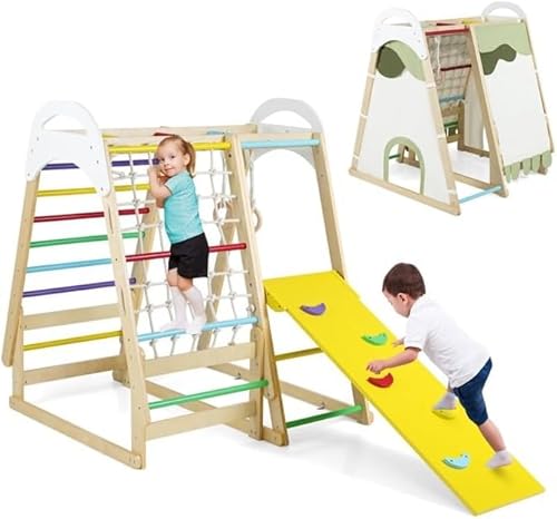 GOPLUS Klätterställning för barn, klätterleksaksset med klätterstege och rutschkana och klättringsnät och tvärstång, mångsidigt lektorn, klättertorn, inomhus av trä för barn från 1 år (färgglad)