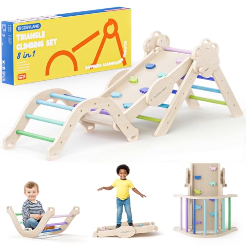 COSYLAND 8-i-1 Inomhus Klätterställning för Småbarn – Triangeldrabb Klättertriangel med Klätterbåge & Rutschkana – Hopfällbar Klätterleksaker i Trä för Barn 18 Månader – 6 År, Medium, Flerfärgad