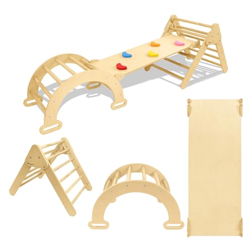 FANTASK Klätterutrustning i trä, inomhus klättertriangel multifunktionell med vändbar ramp, gungbräda, justerbar klättrare för barn från 3 år