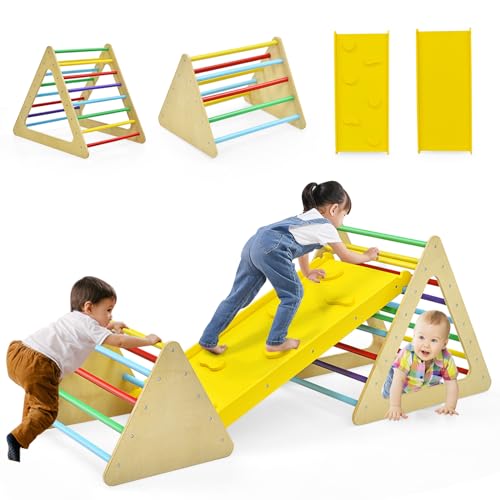 GOPLUS Klättertriangel inomhus, klätterställning med justerbar klätterstege och vändbar klätterramp, rutschkana och gungbräda, inomhuslekplats för småbarn från 3 år (färgglad)