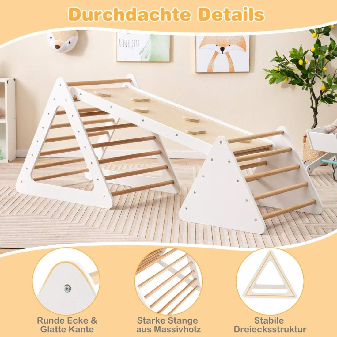 COSTWAY 4-i-1-klättertriangel med rutschkana, klätterställning i trä, ribbstångstriangel för att glida och klättra, för barn från 1 år (vit + natur)