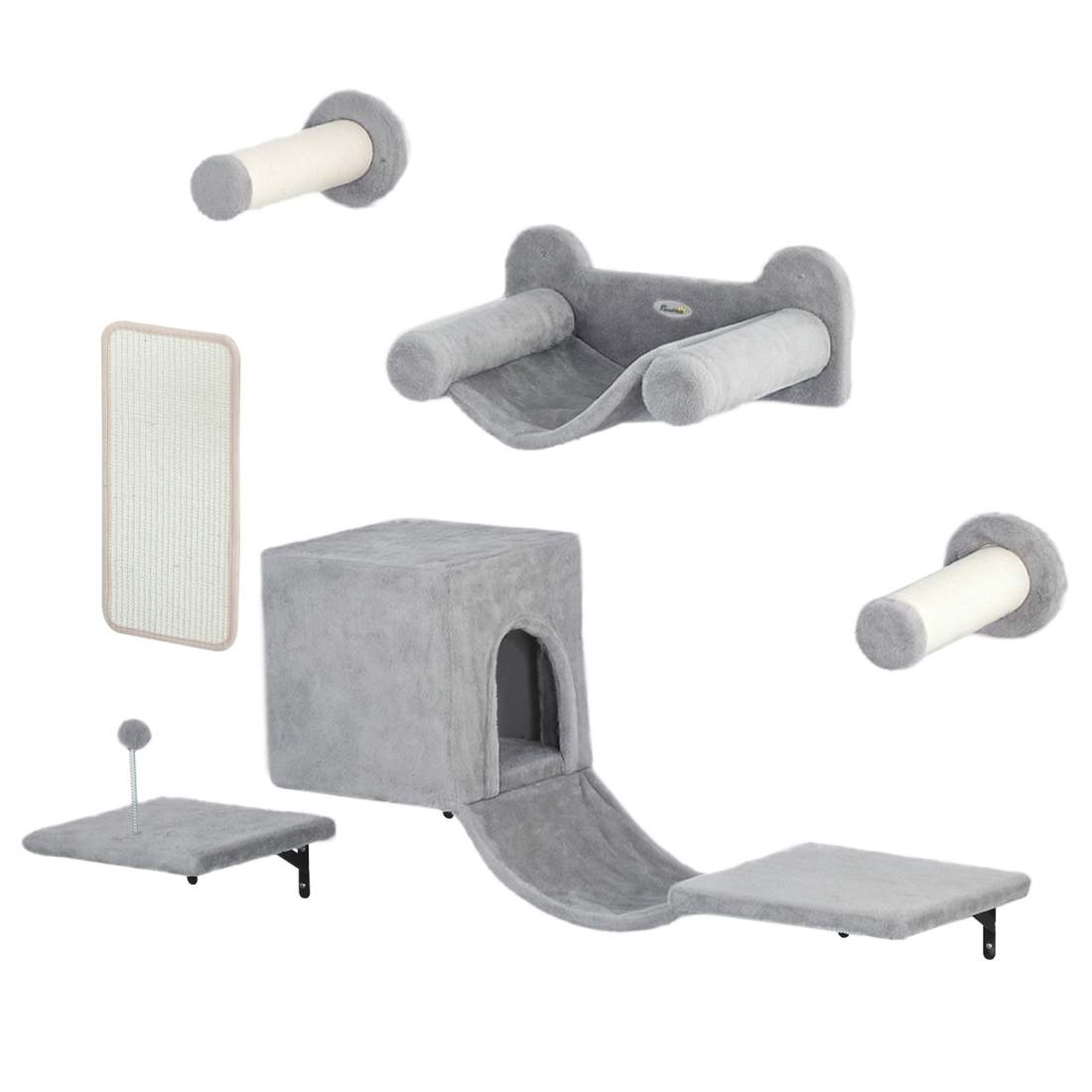 Klättervägg för katter 6-delad kattklätterväggssats med katthus, hängmatta, plattform och skrapbräda grå