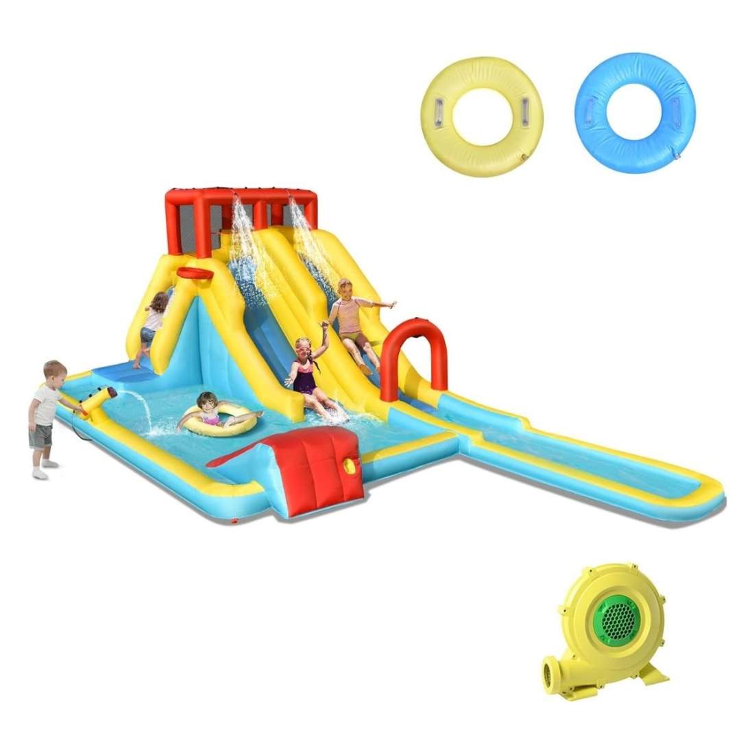 Hoppborg med fläkt, vattenrutschbana, plaskdamm, bollgrop, klättervägg, kastring, hopp, basketkorg, vattenkanon, uppblåsbar hopp