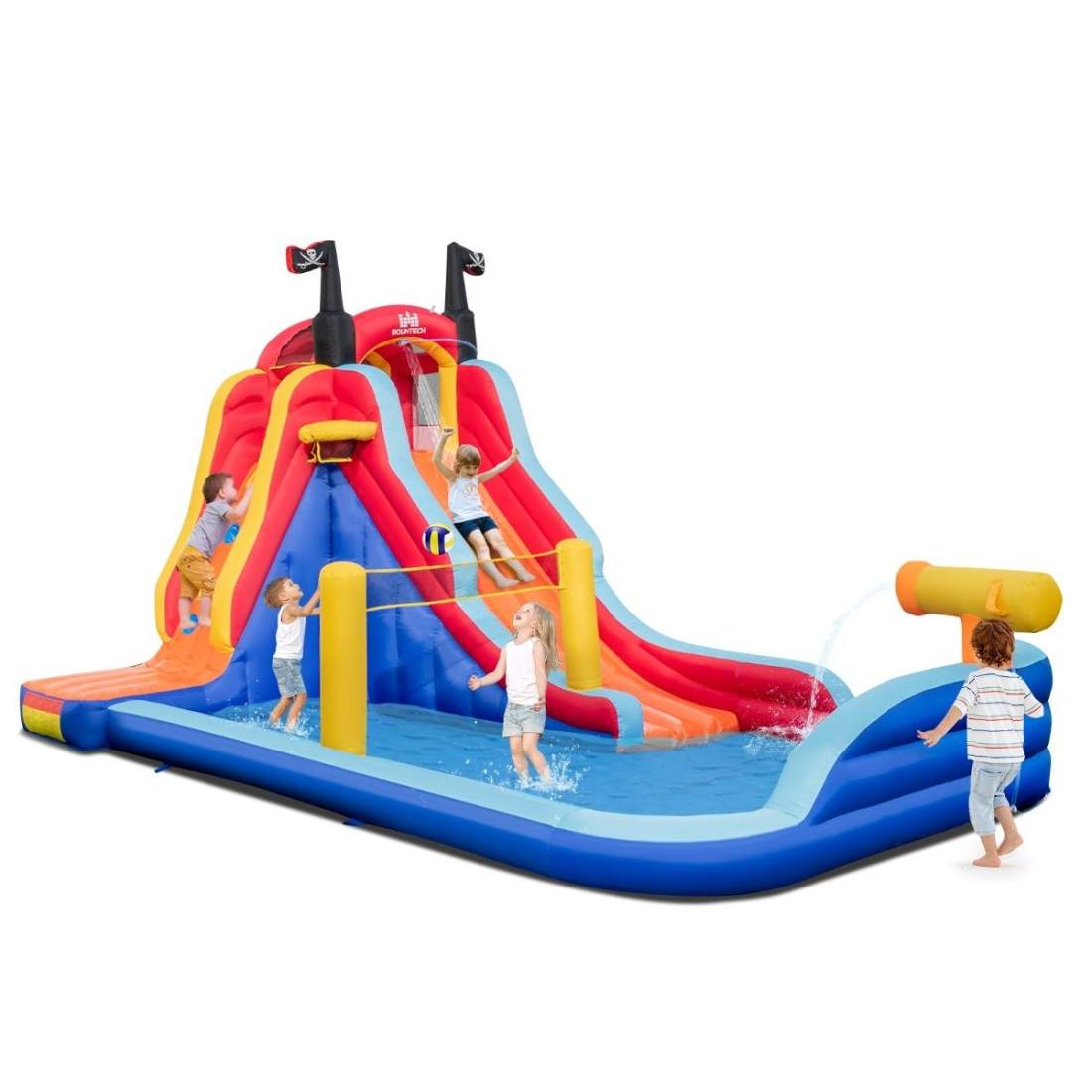 5 i 1 uppblåsbar vattenpark med pirattema med rutschkana, plaskdamm, basketkorg och klättervägg utan fläkt