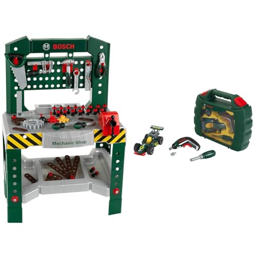 Theo Klein 8574 Bosch arbetsbänk i 77 delar | Med skruvmejsel och mycket annat| för barn från 3 år & Theo Klein 8395 verktygsväska set Bosch Grand Prix med Ixolino-skruvdragare | för barn från 3 år