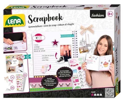Lena 42332 gör-det-själv pysselset, scrapbooking klippbok, fotobok med 100 sidor, 50 fotohörn, 2 slipklämmor och 18 klistermärkesark, för barn från 8 år
