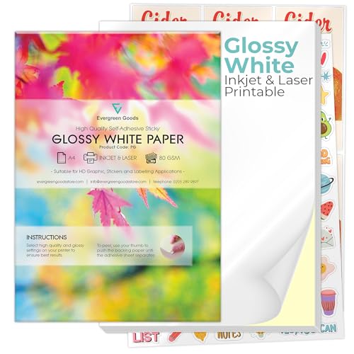 Evergreen Goods 100 ark glansigt vitt utskrivbart klistermärke papper A4 (210 x 297 mm), bläckstråleskrivare och laserutskrivbara självhäftande etiketter, stark klibbig baksida för cricut, gör dina