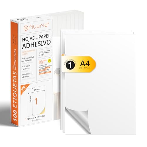 OFITURIA - Vit självhäftande etikett (A4) Klistermärke för utskrift Pack 100 Folios med permanent självhäftande papper och enkel start (100 ark, A4)