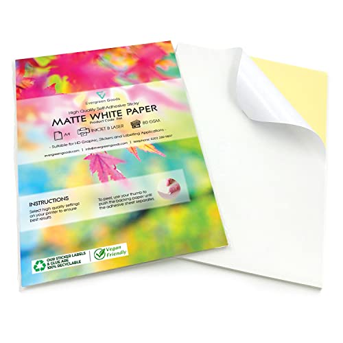 Evergreen Goods 50 A4 vitt ark utskrivbart klistermärke papper - 80 gsm | självhäftande klibbigt matt vitt papper | bläckstråleskrivare och laserutskrivbart | HD-grafiska gör-det-själv-klistermärken,